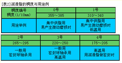 1.脂潤(rùn)滑脂潤(rùn)滑是由基礎(chǔ)油、增稠劑及添加劑組成的。使用時(shí),應(yīng)選擇適合于軸承使用條件的潤(rùn)滑脂。即使是同類潤(rùn)滑脂,由于生產(chǎn)廠家及商標(biāo)不同,性能上可能會(huì)有較大的差別。在選擇的時(shí)候要特別注意。潤(rùn)滑脂的稠度與用途的例子參見[表2]